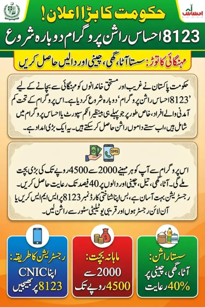 8123 Ehsaas Rashan Program is a major social welfare initiative of the Government of Pakistan to support poor and deserving families facing rising inflation and food insecurity. Under this program, eligible households receive subsidized essential food items through utility stores and registered kiryana shops. The government has restarted online and SMS-based registration so that more families can benefit without difficulty.