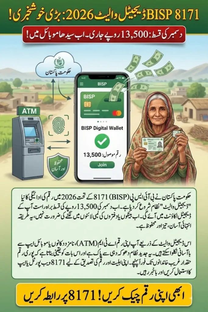 The BISP continues to empower low-income families across Pakistan by providing timely financial assistance. In 2026, the BISP 8171 digital wallet initiative allows beneficiaries to receive and track their Rs. 13,500 payment for December efficiently. This digital wallet system eliminates the need for physical cash collection, ensuring secure, transparent, and quick disbursement of funds directly to the eligible households.