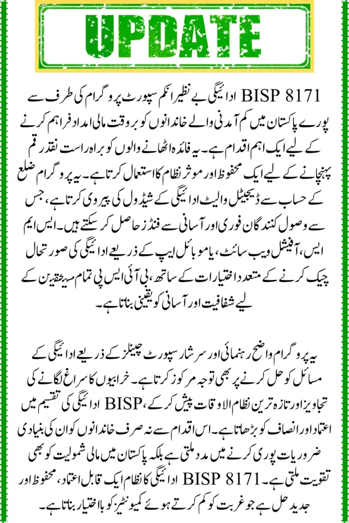 BISP 8171 Payment is a cash assistance program under the Benazir Income Support Programme. It supports low-income families across Pakistan.