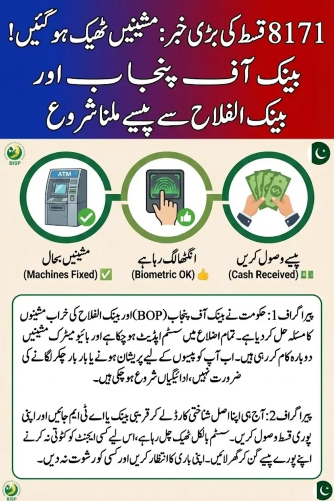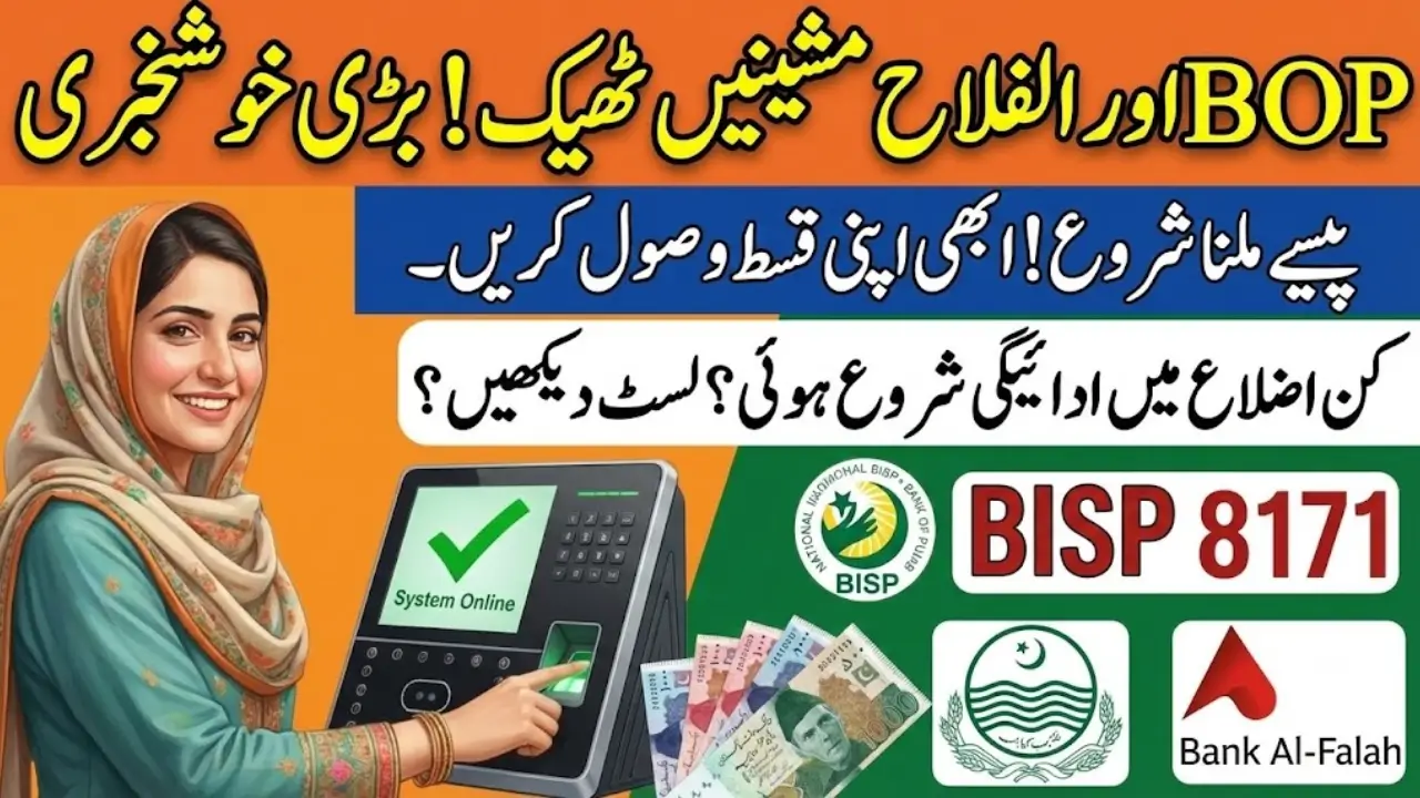 BISP 8171 Qist Update: BOP and Bank Al-Falah Machines Fixed, Money Now Available in Different Districts. Yeh Programme Pakistan ke ghareeb aur mustahiq gharanon ke liye bohat bara sahara hai. Lakhon auratein apni daily zarooriyat jaise ration, bachon ki fees aur dawa ke liye isi Qist par depend karti hain. Pichlay kuch dinon se jab bank machines kaam nahi kar rahi thin to auraton ko bohat mushkil ka samna karna para.