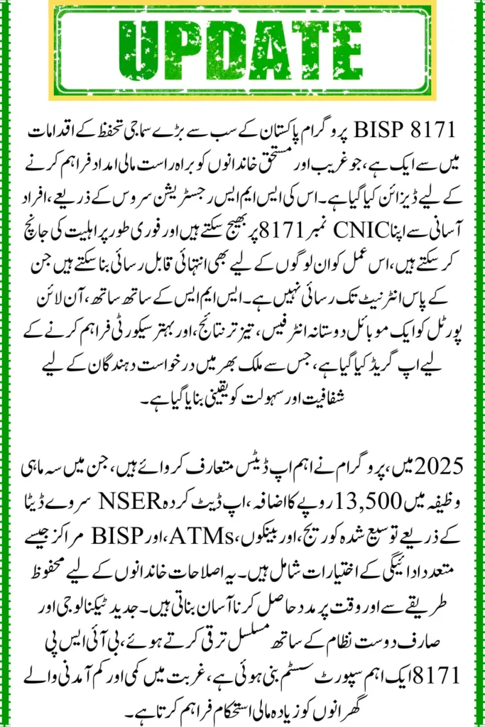- SMS and online tracking remain active, where you can enter your CNIC via SMS to 8171 or use the portal to check payment and eligibility status