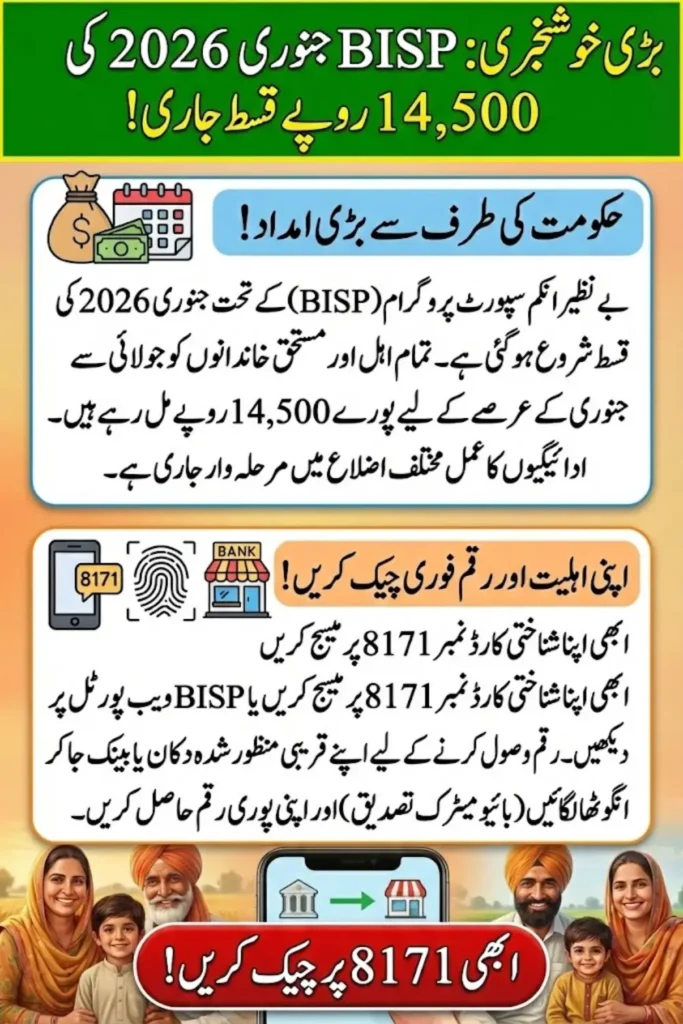 BISP has started the January 2026 payment cycle. Eligible families receive Rs. 14,500 for the July–January 2026 period. Payments began on October 16 in cluster districts and will expand in phases.
