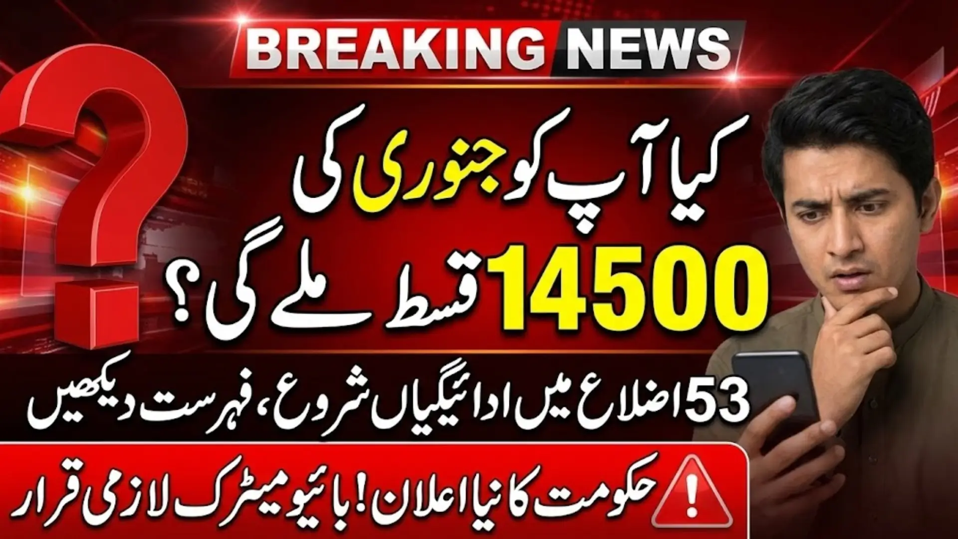 The BISP has initiated the January 2026 payment cycle, distributing Rs. 14,500 to eligible families. The first phase covers 53 districts, prioritizing flood-affected, rural, and high-poverty areas. Payments are being made through digital accounts, ATMs, retail agents, and Tehsil offices. Biometric verification is required for collection.